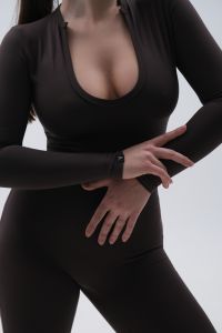 Довгі рукави додають образу цілісності та роблять комбінезон комфортним у прохолодну погоду або для залу з кондиціонуванням. Округлий виріз у зоні декольте виглядає м’яко та жіночно, не перевантажуючи дизайн. Завдяки подовженому формату комбінезон можна носити як самостійну річ — достатньо додати кросівки, черевики чи підбори — або поєднувати з жакетом, тренчем, oversize-сорочкою чи шкіряною курткою.