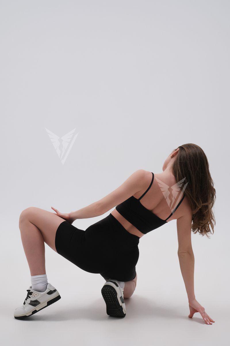 Базова палітра відтінків — чорний, білий, темно-синій, кавовий, холодний та теплий графіт — дозволяє зібрати як мінімалістичні монохромні сети, так і контрастні поєднання з яскравими низами чи аксесуарами. Це топ, який легко працює і як спортивний, і як повсякденний.
